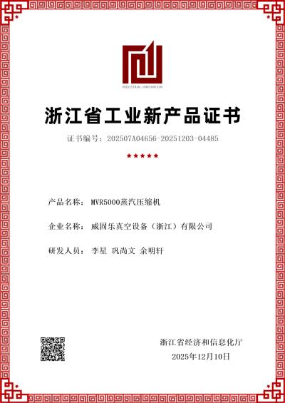 Recently, Vacculex Vacuum Equipment (Zhejiang) Co., Ltd. announced exciting news: the company’s independently developed MVR5000 Steam Compressor has officially been awarded the Industrial New Product Certificate. This latest recognition from an authoritative body further consolidates the company’s leading position in the industrial technology sector.